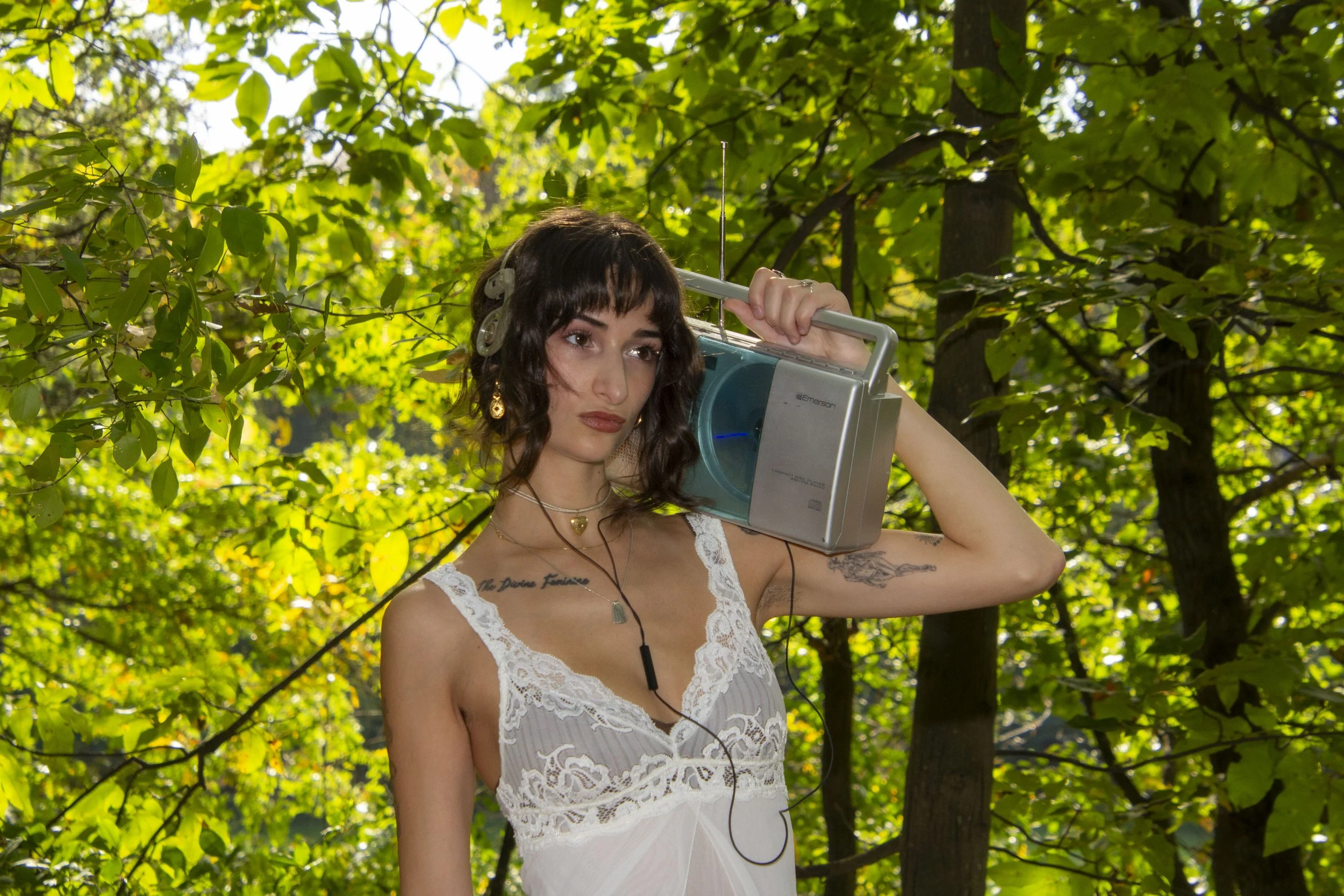 A: During the bubble-gun photoshoot scene, we were shooting on a polaroid camera which was so cute and fit the vibe perfectly, but it was so cold that the camera was struggling to function/keep up...so we were trying to get video takes with quick flashes one after another, but I would push the button and nothing would happen. [It] was just a funny thing to navigate while trying to look cool and music-video-y. Also, our shoot was [on] the day that daylight savings started, so when we were shooting outside, we kept having to move our picnic blanket set-up to chase the light at like 3pm. It was an extra rude awakening.