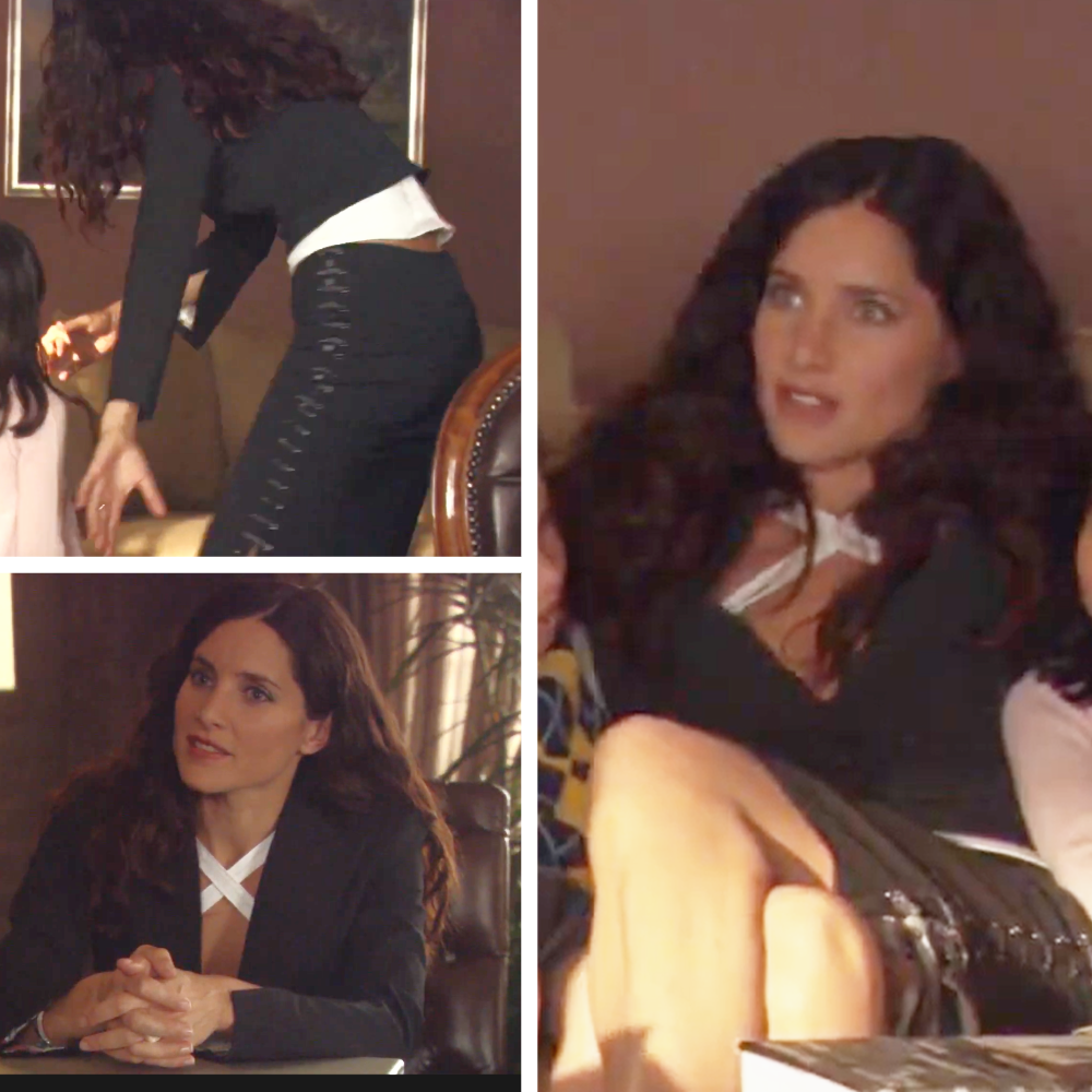 THIS is how you introduce a character bitchhhh oh my goodness. The white criss-cross top under the cropped blazer was already so fab, and then she stood up. That pencil skirt secured with what looks like safety pins?? At the office?? Insane.