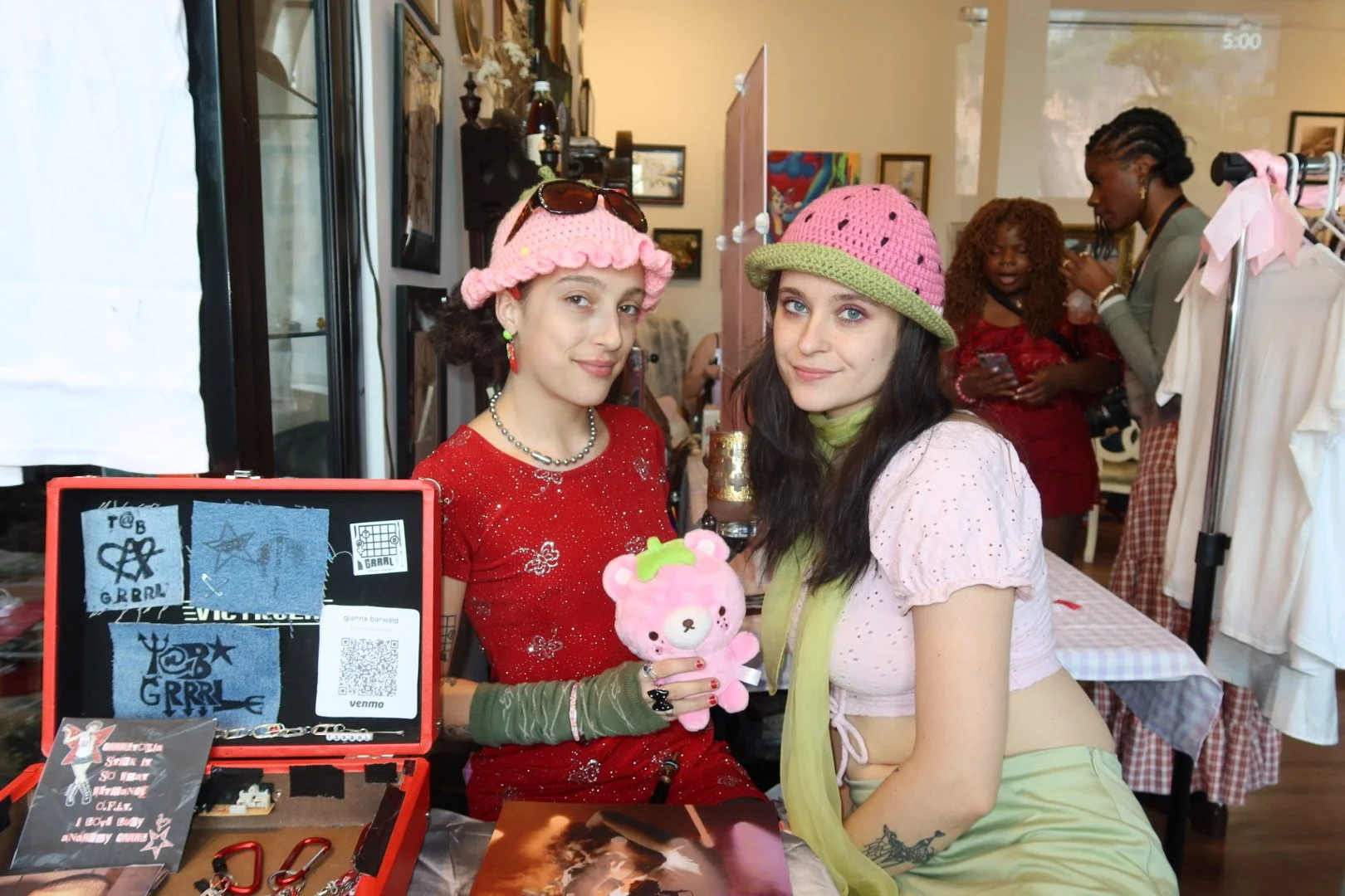 The room was glowing with friendly faces and tables overflowing with art, jewelry, and zines. It was so fun to see how the vendors and guests dressed in Halloween costumes like Strawberry Shortcake characters, clowns, cats, and the costume contest winners, a month-to-flame duo. All around, you were surrounded by crochet garments, handmade jewelry and trinkets, and Riot Grrrl bands with their merch. It was the kind of market that reminded me why I love these spaces so much and the community that grows from them.