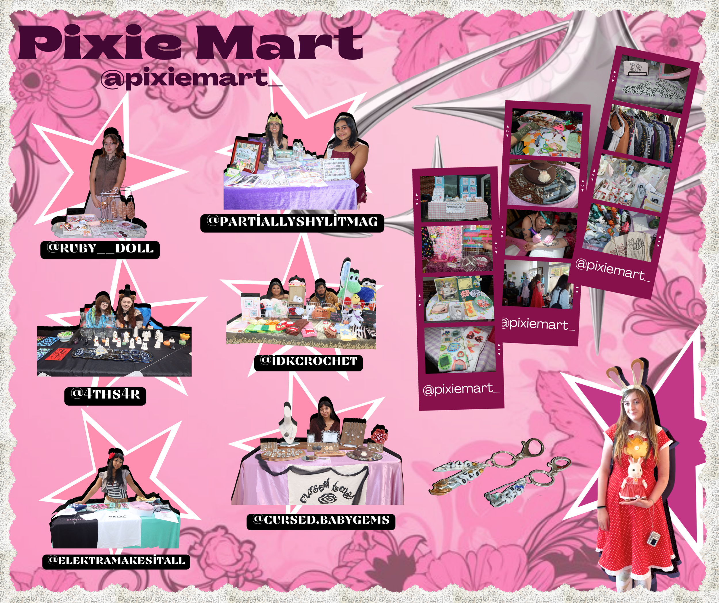 What I loved most about Pixie Mart was the way it balanced so many different elements at once. It felt like pastel sweetness mixing with raw, loud, creative energy. Artists sell magazines like Partially Shy Mag, who are currently working on their sixth issue, Myth and Lore, alongside crochet work from IDK Crochet and metalwork from Cursed Baby, shaped the spirit of the day. If you could not make it to Pixie Mart, below is every vendor’s Instagram handle so you can check them out for yourself.