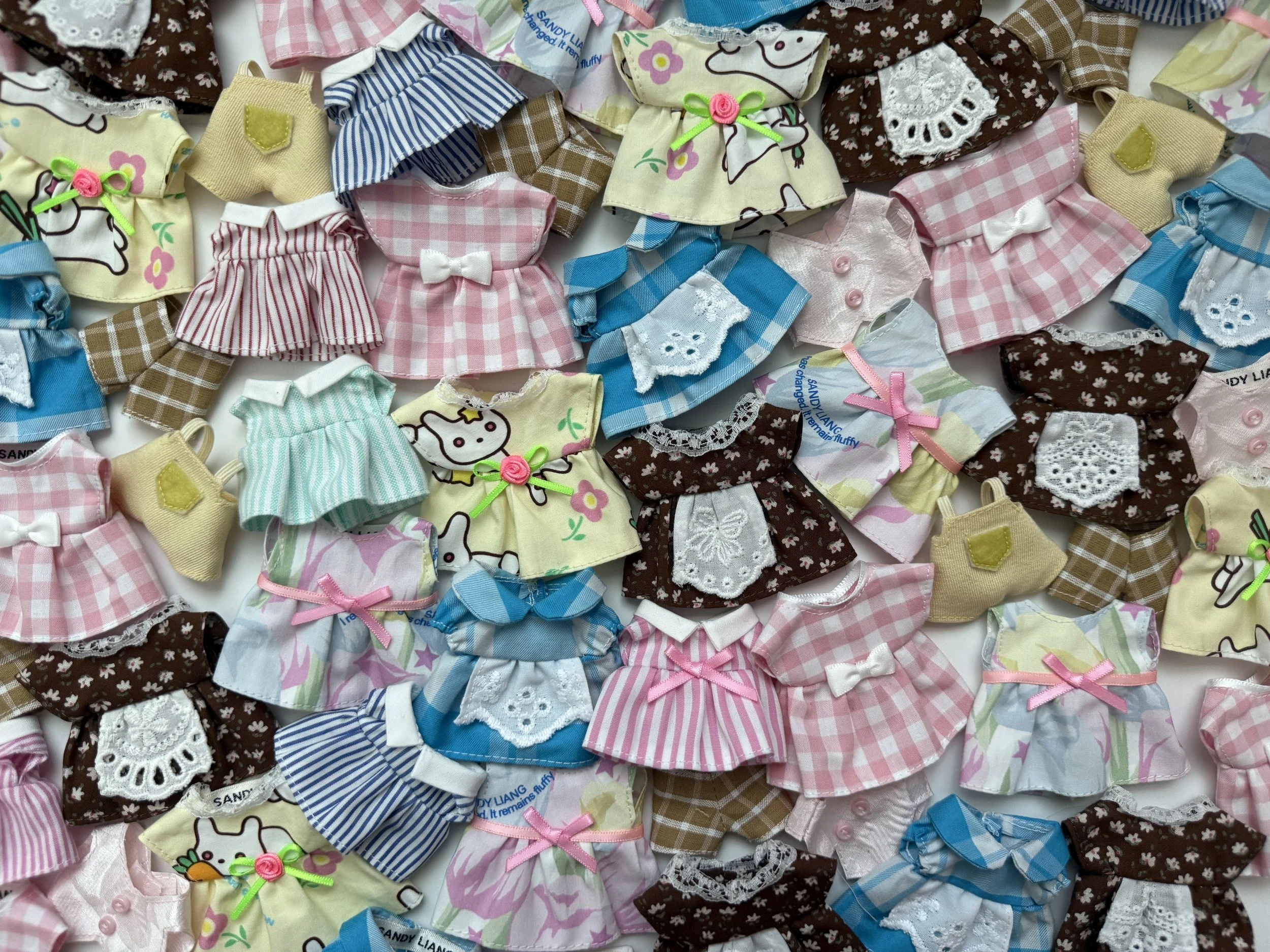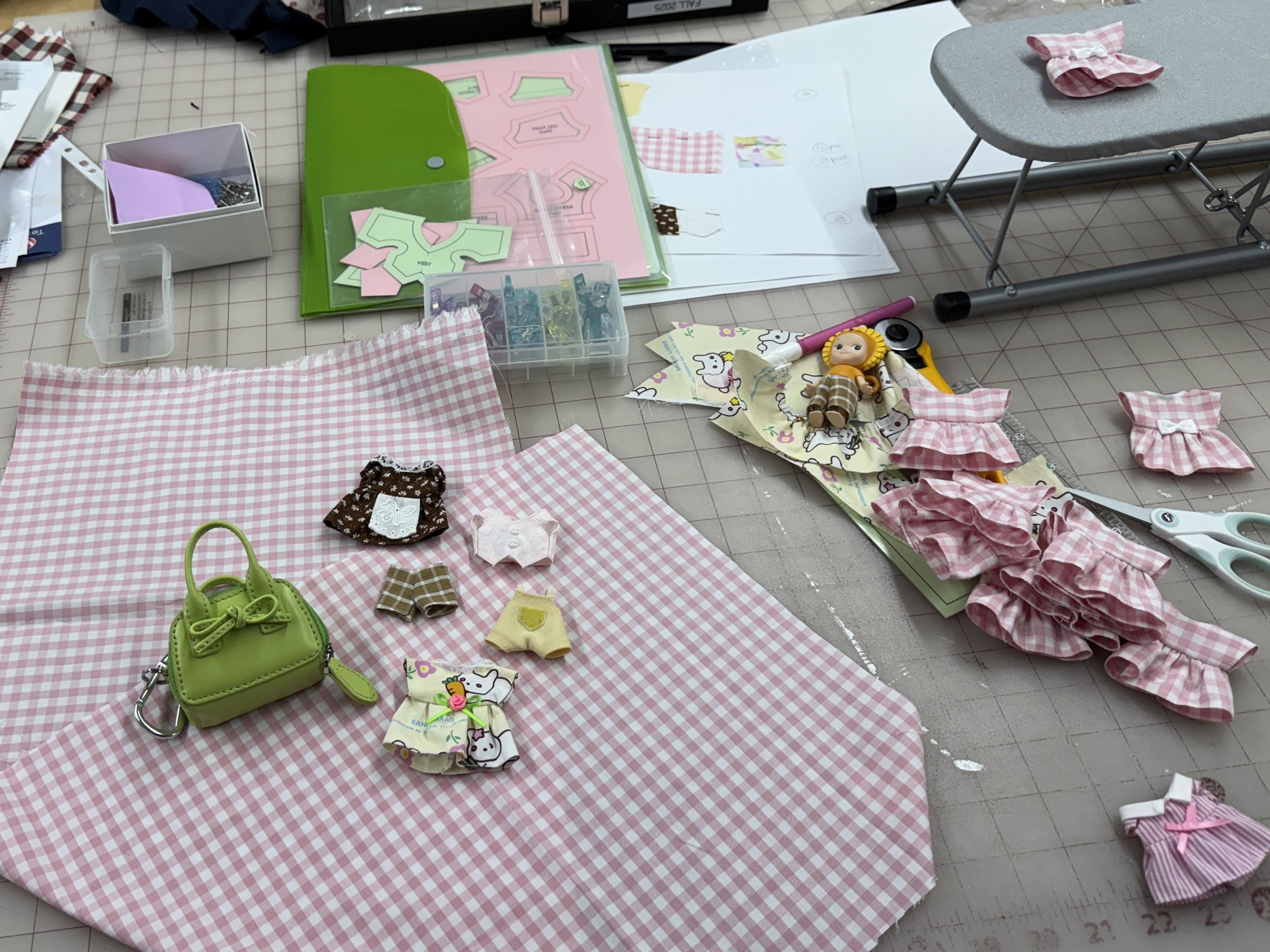 Her first experience designing miniatures for Sandy Liang was in October 2024 for the Sandy Liang x Moncchichi collaboration. Throughout, Lo collaborated with her costume design mentor, a professor experienced in miniature costume design, to seek guidance on the project, blending her academic and professional worlds. She recalls,“ I learned about pattern making on a miniature scale while making this project. I made patterns based on the Monchhichi dolls’ size, and that was where the miniatures were born.”