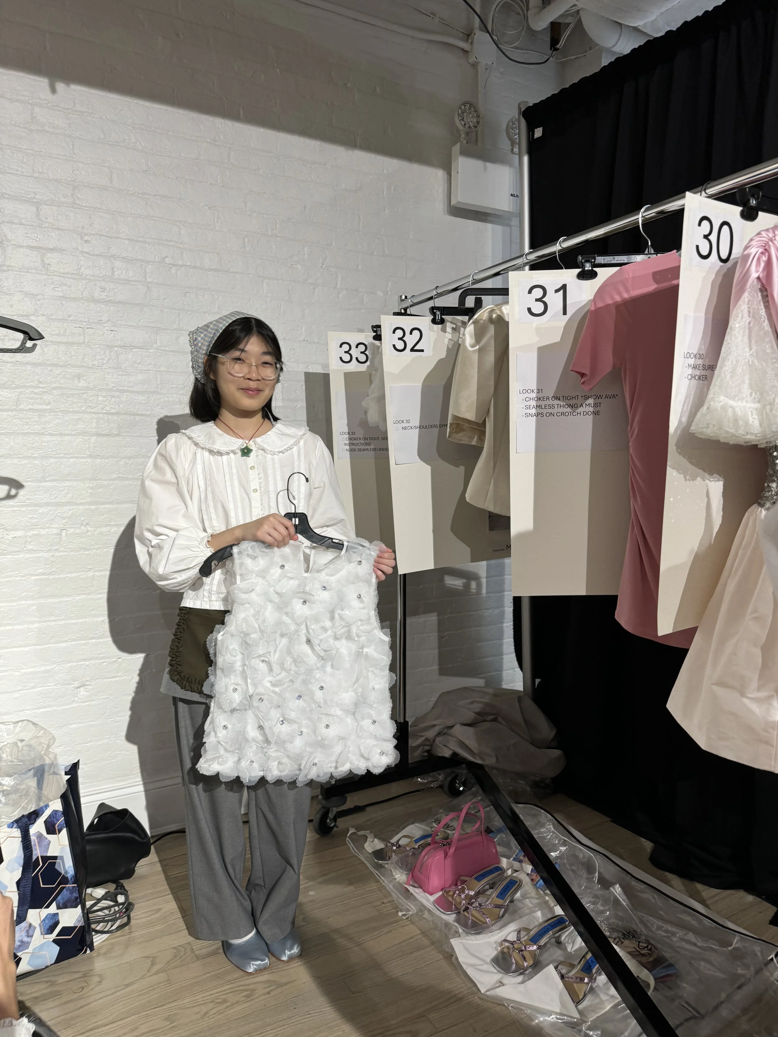 Lo’s favorite project so far is her most recent runway dress, made from 160 mini dresses inspired by Sandy Liang designs.“ It was such a labor of love, but it was really fun. I spent all of August making these little, teeny dresses,” she reminisces. “And overall, it was just very inspiring for me to get to play a part in bringing her vision of girlhood and nostalgia to life in a way that connects with my childhood and upbringing.”