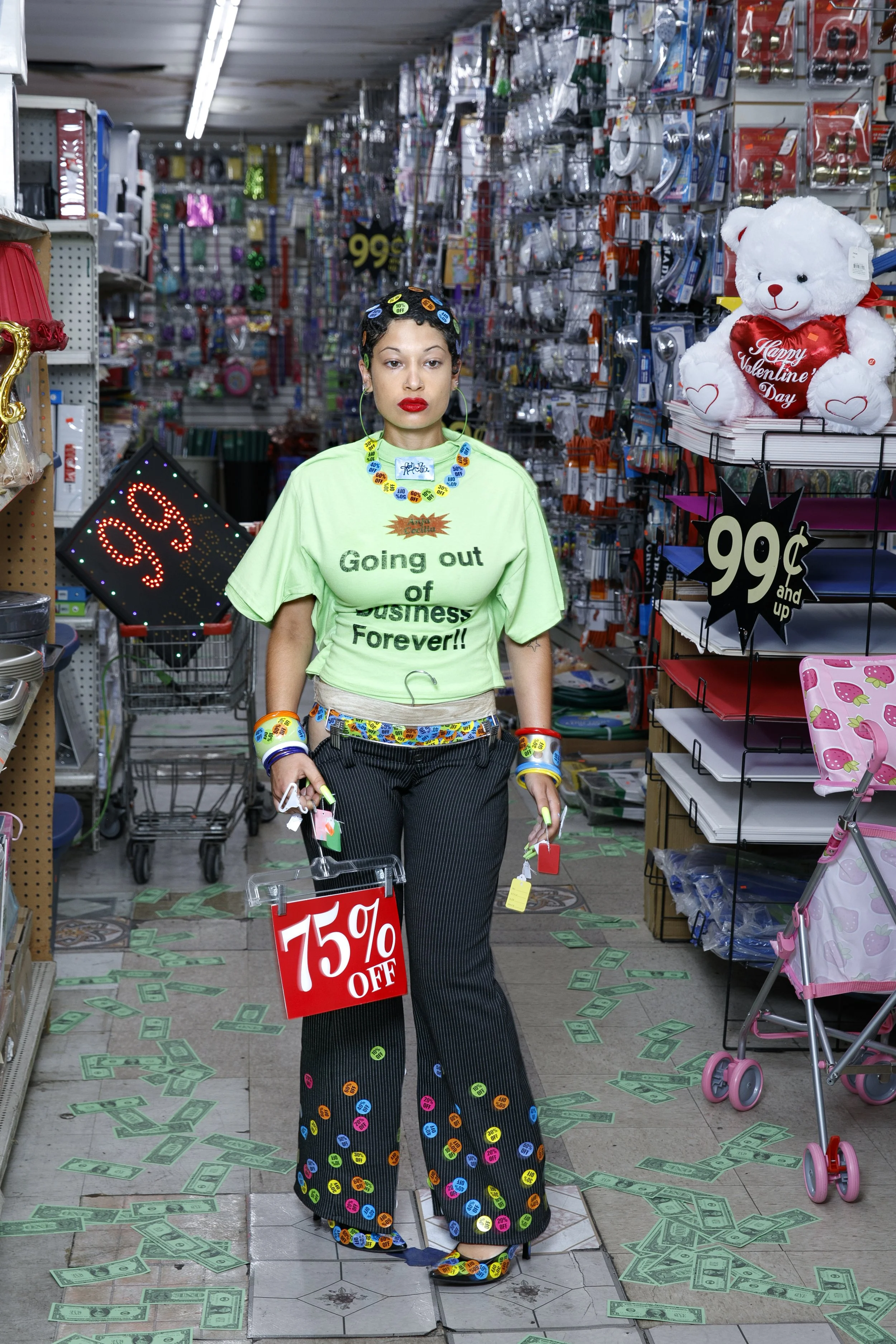 In a dollar store so deep into Brooklyn that it becomes Queens, I’ve stuffed my bag behind a stack of Hubba-Bubba-pink potty trainers and perched myself on a pile of plastic-wrapped duvets. A gaggle of fashion girlies chat excitedly as they wait for the runway show to begin, each sporting their own maximalist ensembles in an effort to match the vibes of the soon-to-be-revealed collection.