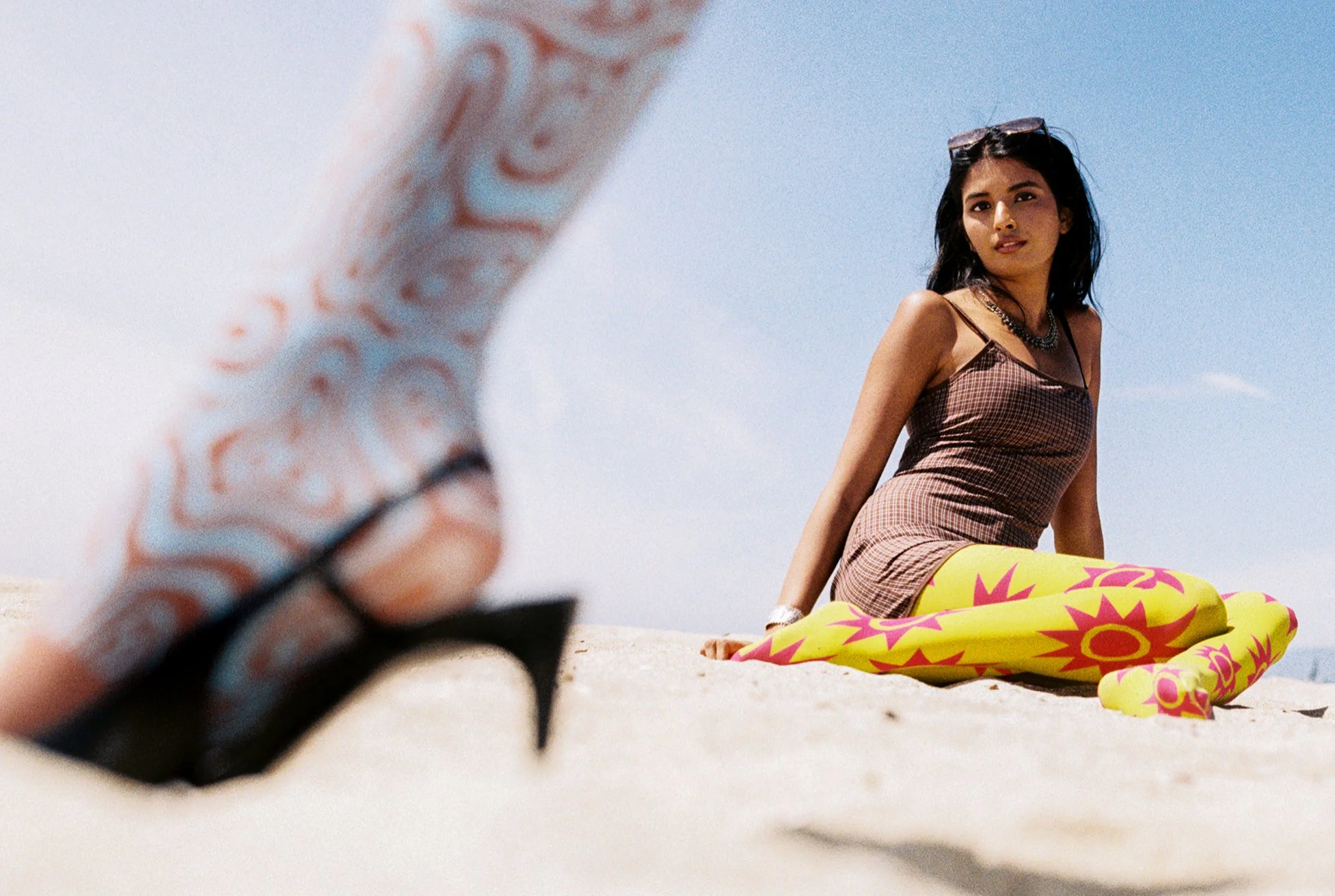 Apart from reclamation and representation, another huge element of Satchy are the dynamic colors and patterns. For example, the Ulta Pulta Tights’ design reinterpetes ancient Indian stripe and check traditions, where vari stripes and kattam checks are among the oldest textile motifs rooted in handloom heritage and daily wear. Meanwhile, the Taara Tights are rendered in vibrant pinks, magentas, and chartreuse, a color story also deeply rooted in Indian textile tradition. Both of the Chakr scarfs from the Spring Collection put a cultural twist on what many of us may perceive as mere“ polka dots”, drawing from ritualistic symbols such as the ones found in Kolam or Rangoli art. Satchy’s pieces are not just gorgeous, they have meaning tied to distinct heritages and customs.